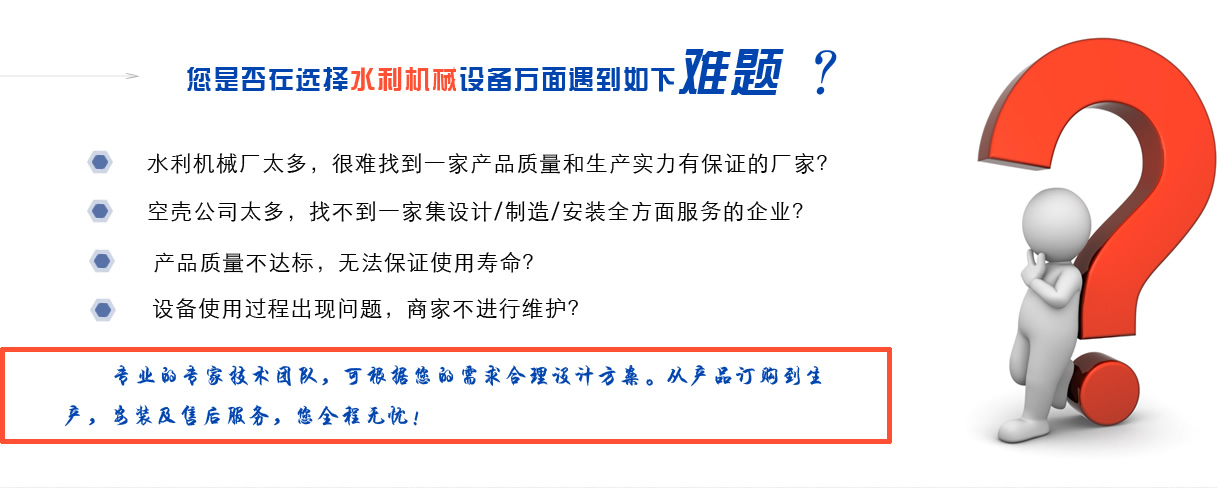 寧晉縣禹碩水利機械有限公司     寧晉縣禹碩水利機械有限公司是一家綜合生產型企業,專業從事液壓式啟閉機,固定卷揚式啟閉機,雙點吊卷揚式啟閉機,鑄鐵閘門及環保設備的專業制造,生產和安裝。具有完善的現代化管理模式,合理的產品結構,可靠的性能,確保為客戶提供優質的產品和周到的售后服務。這是一個整合銷售,制造和安裝的監管模型。水利工程機械生產綜合企業。我們公司已獲得國家頒布的液壓機械產品使用許可證。我們公司生產的產品廣泛用于河道,養殖,排灌,水電站,污水處理等水利工程。     我們的主導產品有:     1.螺桿式啟閉機3T-100T。全封閉式、手推帶鎖式0.3T-30T。螺桿側擺式0.5T-2T。螺絲手和電動手型3T-100T(單雙吊型)。     2.鑄鐵閘板,高壓鑄鐵閘板,雙面止水閘板,平面滑動鋼閘板,平面固定輪鋼閘板,銅鑲嵌鑄鐵方形閘板,圓形閘板,可調堰閘板,鑄鐵翻板閘板(防潮閘門),FRP閘板閘門,不銹鋼閘板閘門,機械閘板一體閘門,徑向閘門,停機閘,不銹鋼閘門等。     3.QPQ,QPK,QPG,QPT和QHQ型卷揚式啟閉機(單、雙點吊式)。     4.HGS旋轉式屏幕清潔劑,FHG反向式屏幕清潔劑,XGS旋轉式屏幕清潔劑,GLS高鏈式屏幕清潔劑,YZL螺旋壓力機,pls平面式屏幕等。     5.橡膠止水片651、652、653的水腫脹和其他橡膠止水片。止水橡膠包括P60,P50,P45,P35以及各種內外角,平板,橋架等。也可以根據用戶要求進行加工和定制。     我們公司的宗旨是:     “以質量求生存,以信譽求發展,以服務求效益”。今天的質量是明天的市場,企業的信譽是無形的市場,顧客的滿意是永恒的市場。以人為本創造產品,以誠信創造輝煌;質量保證,信譽至上”。……